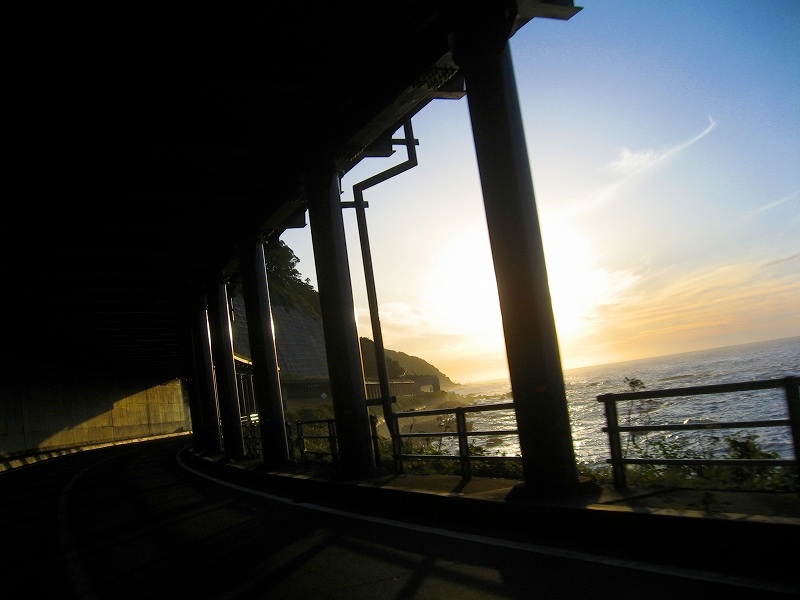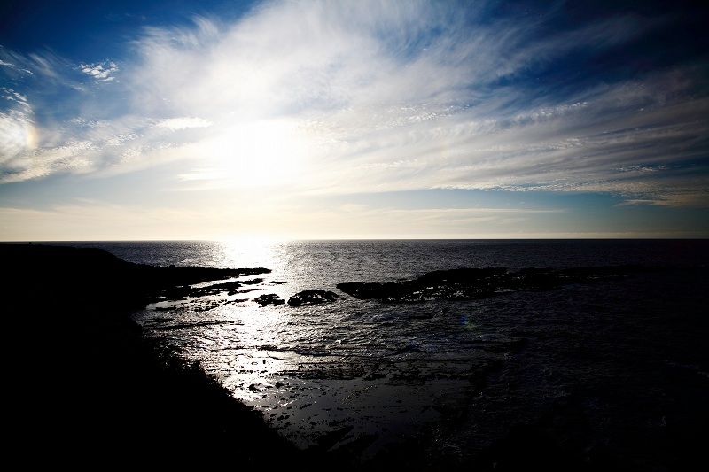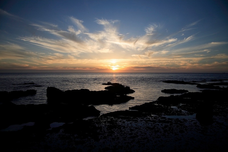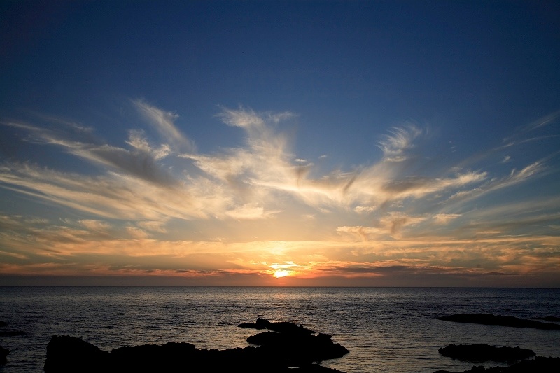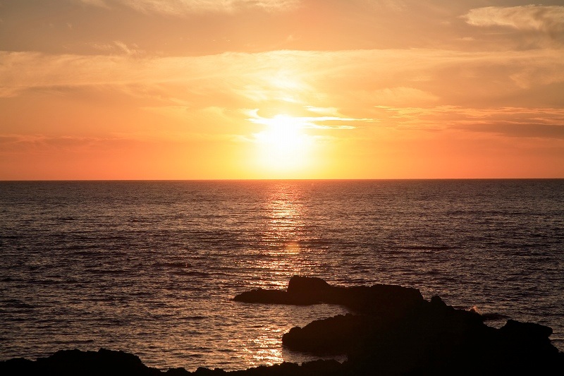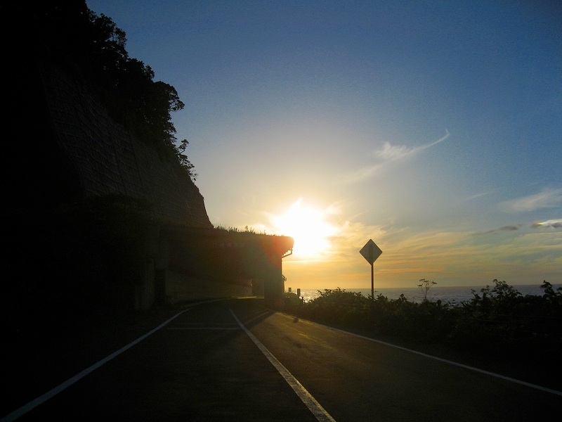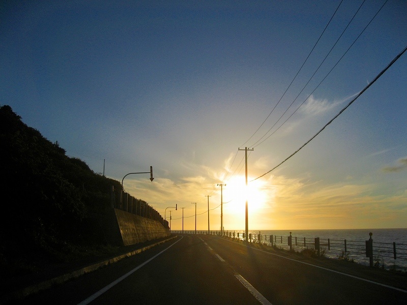瀬棚町の美谷漁港で沈む夕陽を見送る。
