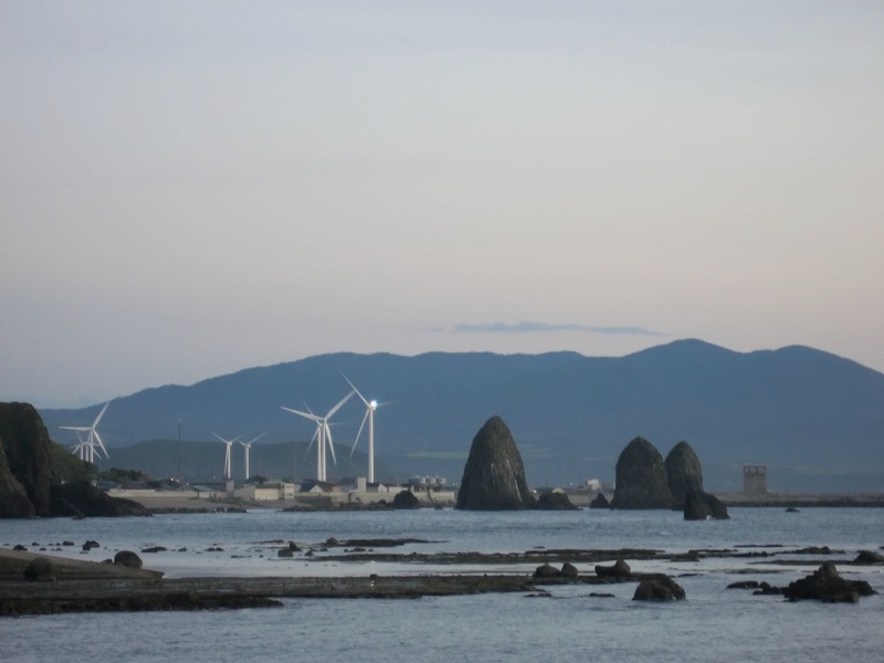 風車とろうそく岩、三本杉岩が海から生える変わった風景の街である。