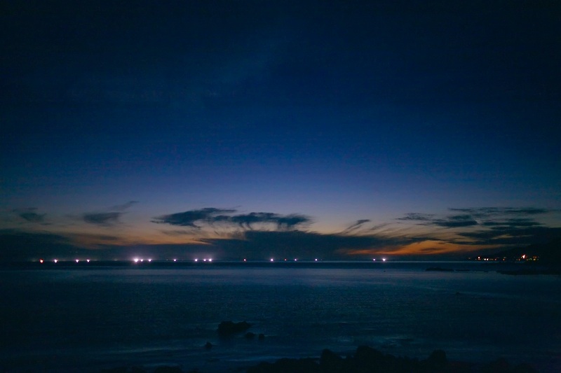 てっくいランド大成という道の駅(てっくいとはひらめのことらしい)を過ぎたあたりの海岸線で見た漁り火。