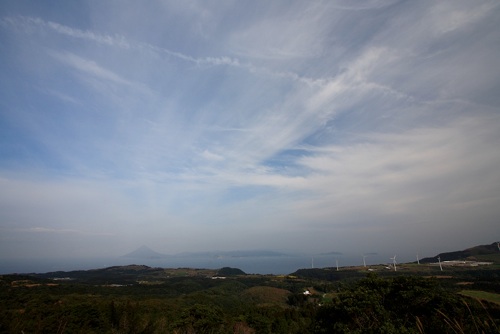 薄雲が広がる天気が残念だが、なかなかの絶景。錦江湾と開聞岳が一望できる。