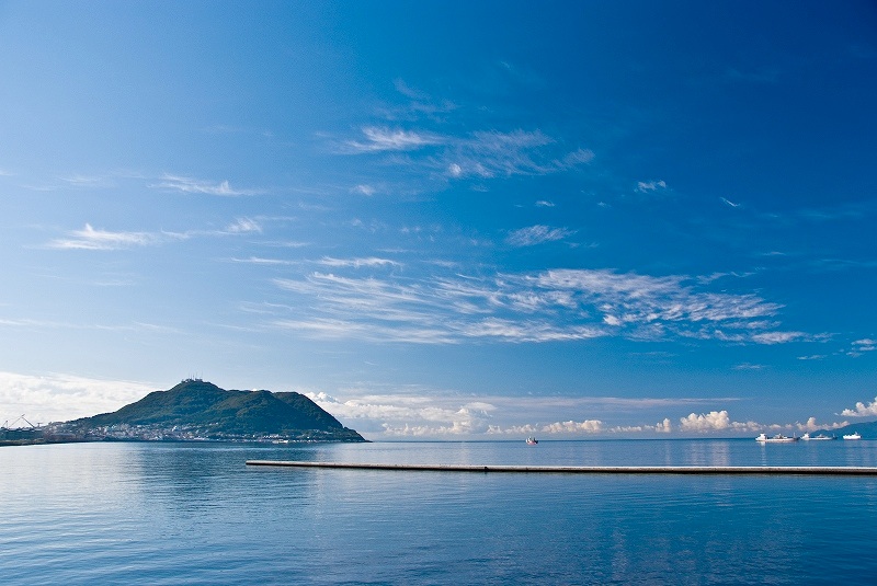 蒼い空に流れる雲、その下に印象的な函館山。