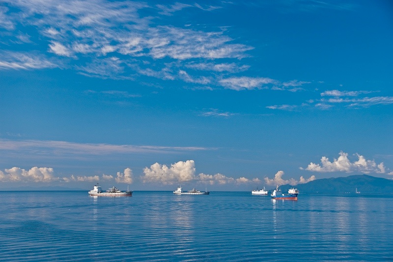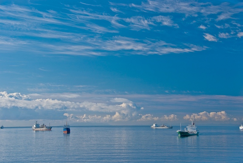 津軽海峡を抜けて航行する船、停泊する船、そして多くのプレジャーボートが海に散らばる。