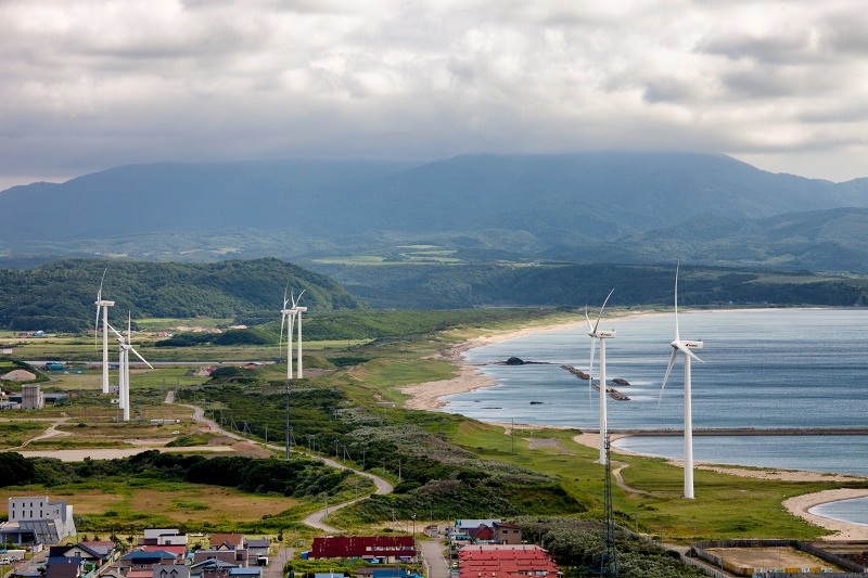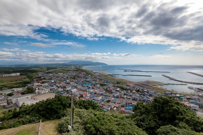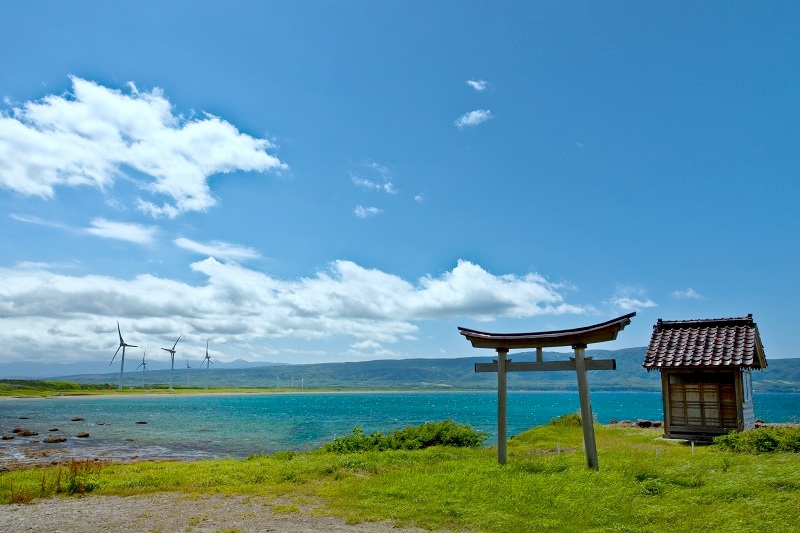 寿都の街が見えてきた。鰊御殿の前にある祠から風力発電のプロペラがよく見える。
