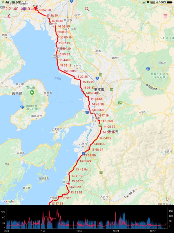 今日の後半のルートです。交通量多い八代から宇土市まで国道走るのは諦め南九州道と九州道で松橋まで北上してしまいました。筑後川の河口あたりも丁寧に走ればもっと時間がかかったと思います。何故か総括が懺悔タイムになってしまうσ(^_^;)