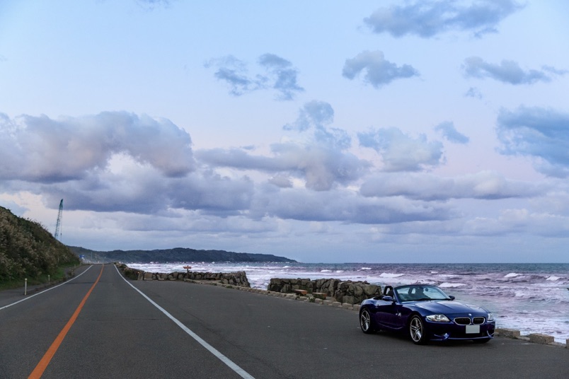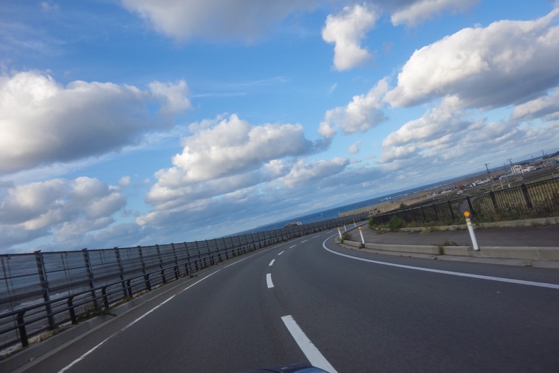 国道402号の海沿いが気持ちのいい区間。低気圧が近づいてきていて波が荒くなってきている。