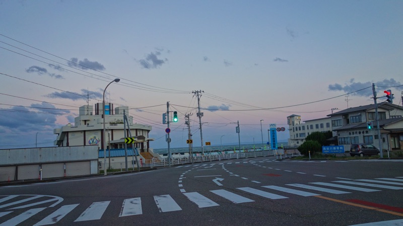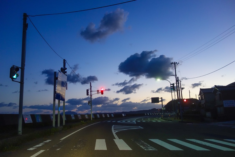 国道352号はここで内陸部へ、直進は国道402号となる住吉町の交差点。東の空が明るくなってきた。