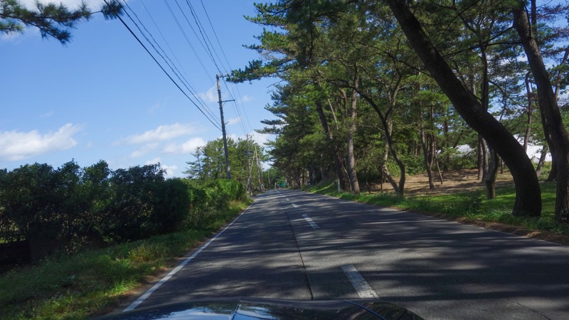 国道112号庄内浜の松林の中を走行中。この先市街を迂回するため県道113号経由で日本海東北自動車道に入って、酒田みなみICまで一気に行きます。
