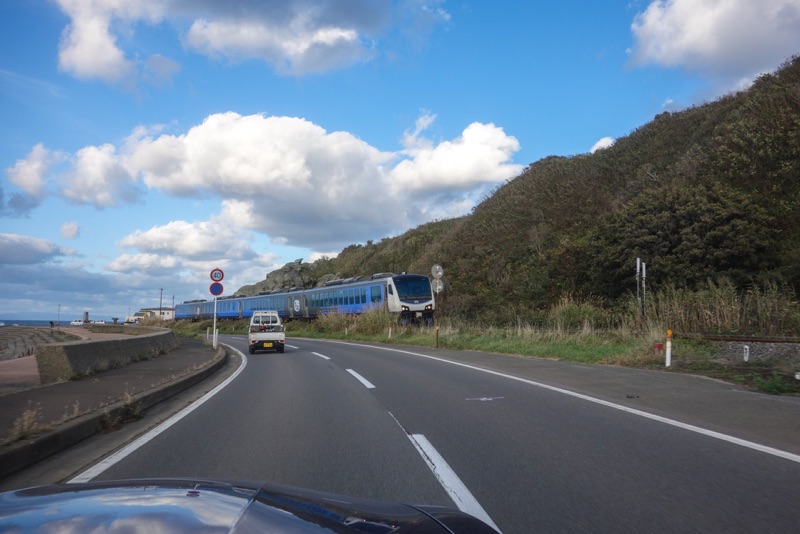 五能線のリゾートしらかみとすれ違います。五能線と海岸線沿いに交差しながら国道101号は進みます。