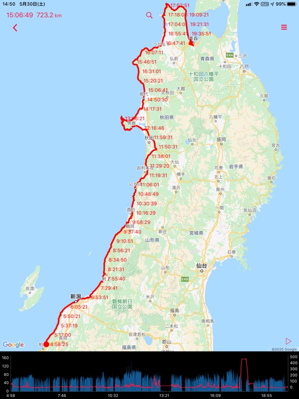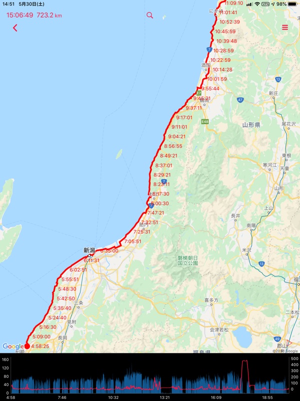 前半のルートです。新潟市内で海底トンネル通行止めによるルート変更はありましたが順調です。