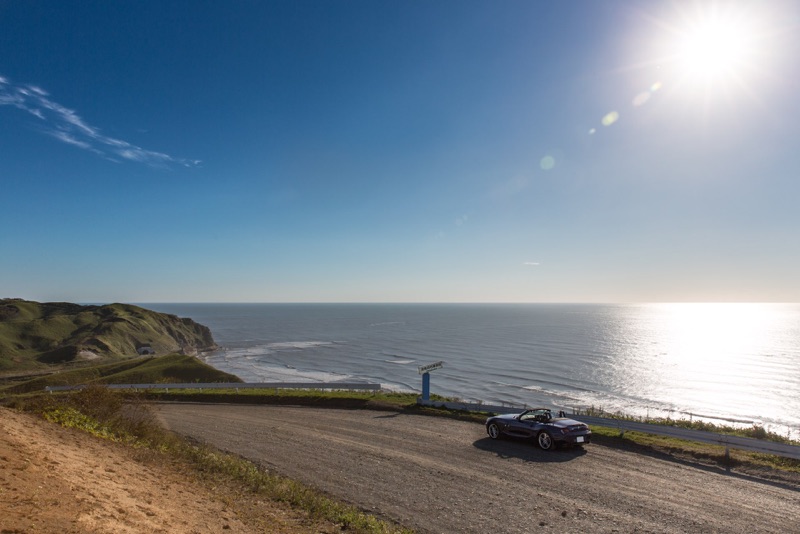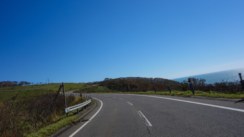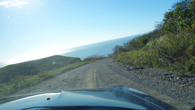 いい天気です。この海沿いのダートは旅心をかきたててくれますね。この道は海岸段丘の上にあり展望も抜群です。