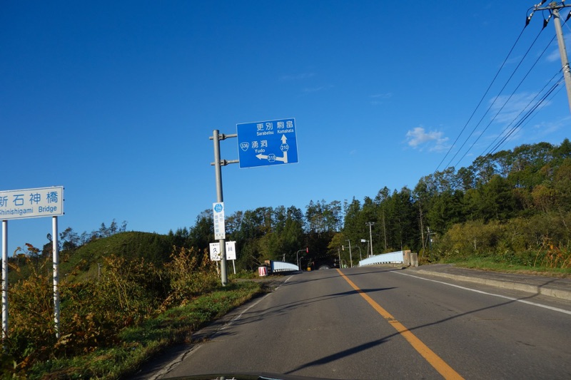 帯広から国道38号、道道210号と走って、湧洞湖へ向かう道道318号に入ります。新石神橋を走行中。