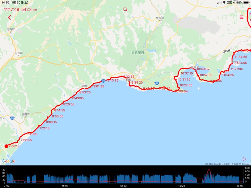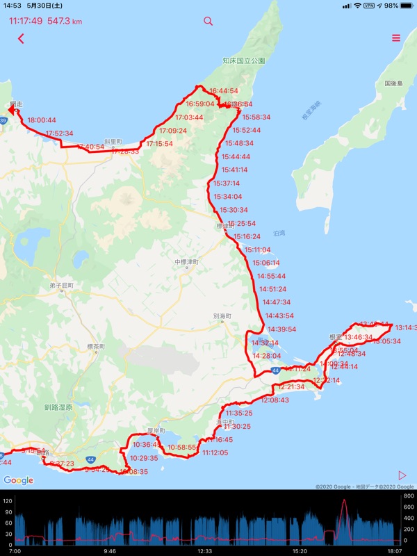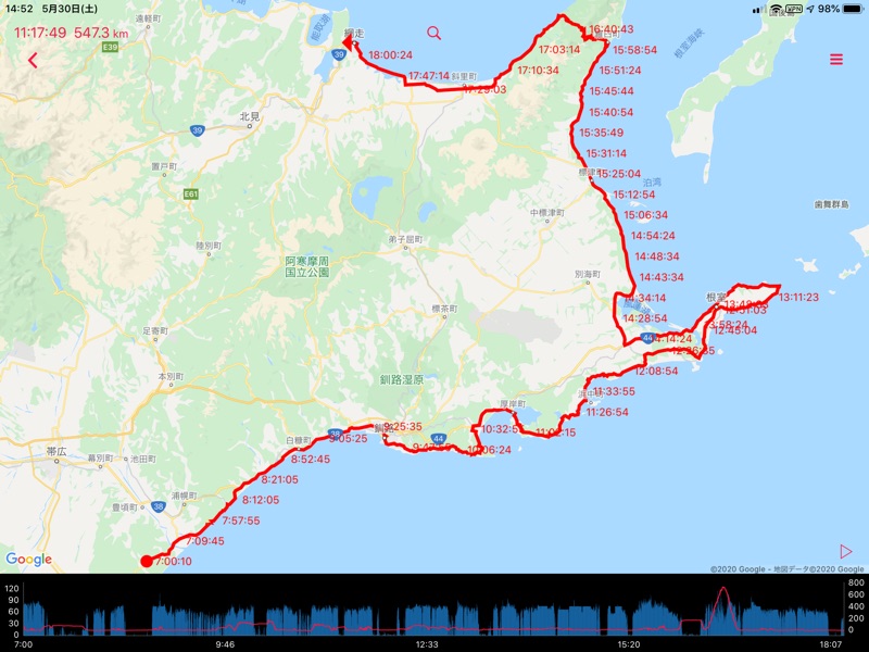 今日の走行距離はGPSだと547.3kmですが帯広からスタート地点まで54kmなので601.3kmが今日の走行距離です。北上をもっとゆっくり回って斜里がゴールでも良かったかもしれません。