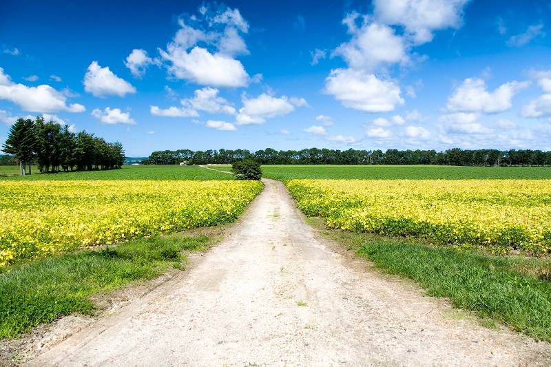 黄色と緑の農地が広がる